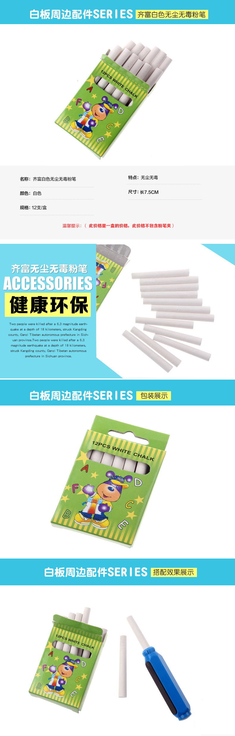 齐富(QIFU) 齐富粉笔儿童绘画安全粉笔夹12支装环保教学 白色粉笔